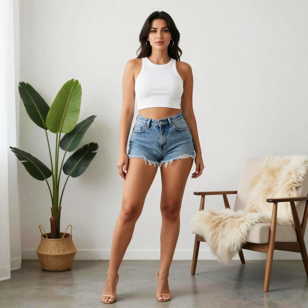 A woman stands confidently in a modern minimalist room, wearing a white crop top and light blue denim shorts. A potted plant and a cozy chair with a fur throw complement the serene, stylish setting.