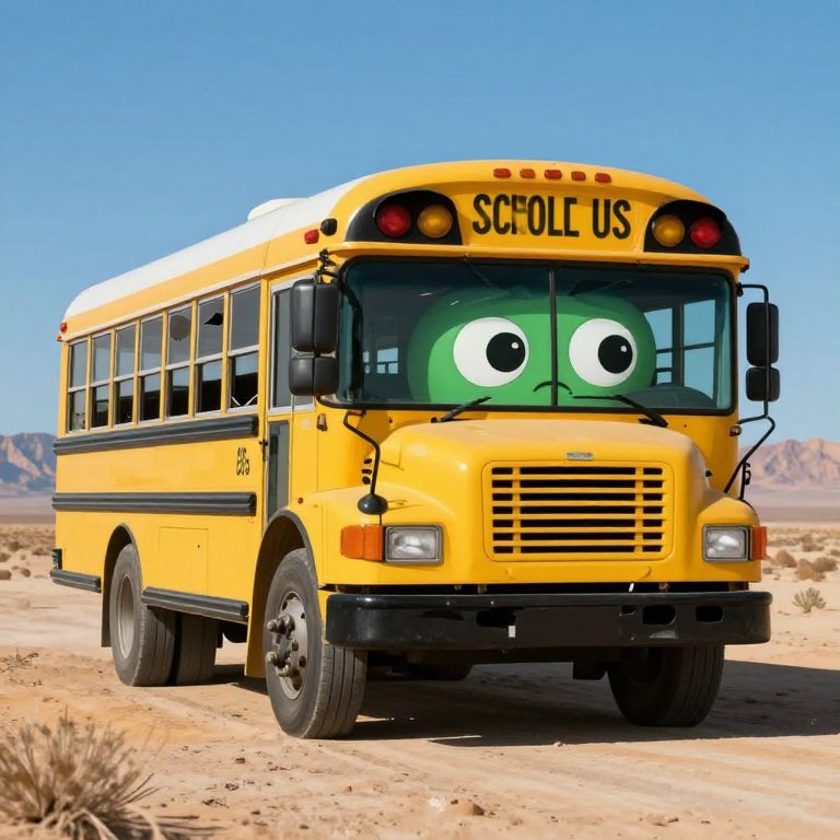 The image depicts a whimsical, anthropomorphic school bus with a minimalist design, reminiscent of the art style of Simon Stålenhag and lightly mixed with Takashi Murakami's playful aesthetics. The bus, painted in a vibrant yellow with a green face, stands out against the clear blue sky. Its large, expressive eyes and a mouth with a sad expression give it a melancholic yet charming appearance. The bus's front features a series of tentacle-like appendages, adding to its unique and fantastical design. The windows are broken, suggesting a sense of abandonment or neglect. The bus is situated in a desert landscape, with sparse vegetation and a distant mountain range in the background. The overall composition is balanced, with the bus centrally positioned and the surrounding elements creating a harmonious yet surreal scene.