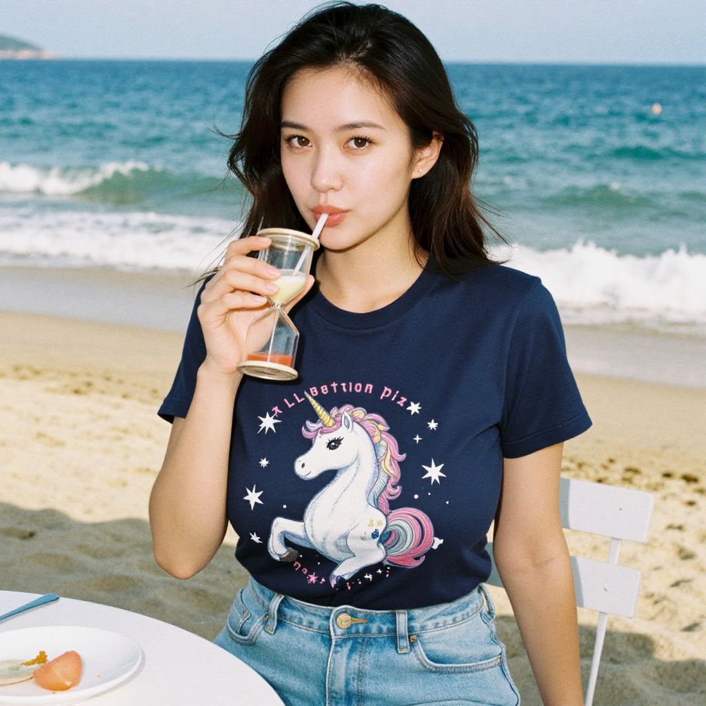 A Hourglass woman in a navy blue graphic t-shirt featuring a fantasy unicorn print, paired with light blue denim jeans, is seated at a seaside table on a sandy beach, enjoying a refreshing drink as the waves gently lap at the shore. Visual style: Medium format film. Sexy. Pretty face and beаutiful eyes. Big breasts