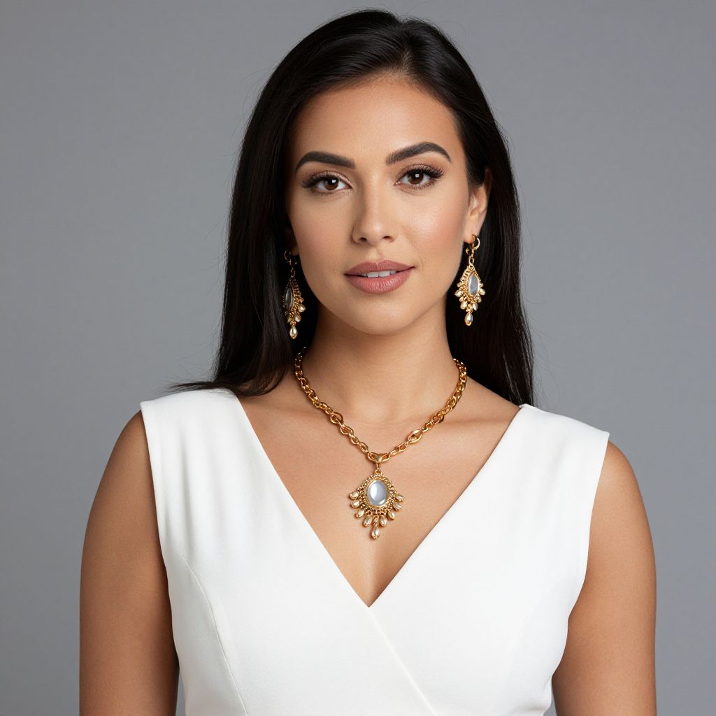Oblina Costume, woman in a white dress with a gold necklace and earrings