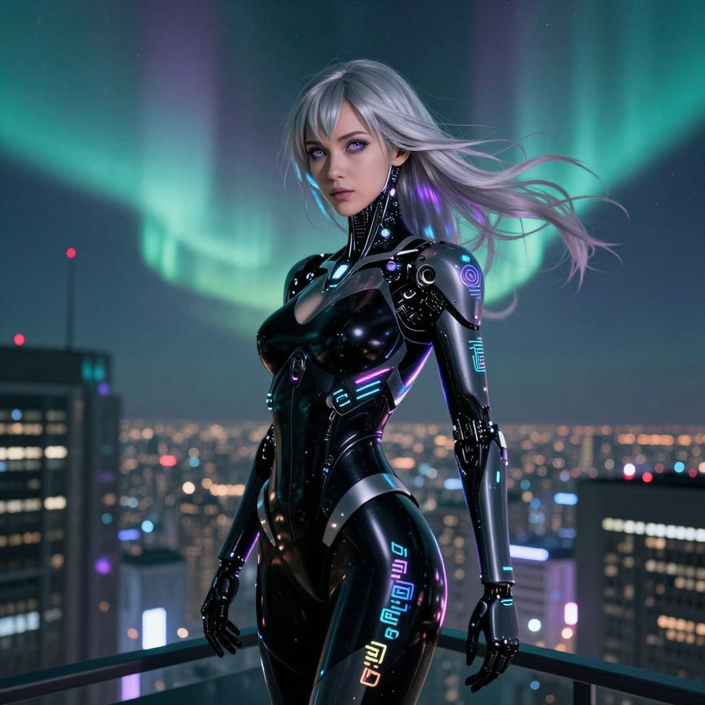 The image depicts a highly detailed, futuristic female figure with a metallic, silver body adorned with teal accents. Her form is sleek and humanoid, with a prominent chest piece featuring a glowing, circular light at its center. The figure's arms are adorned with intricate, teal lightning patterns that extend from her hands, creating a dynamic and otherworldly effect. Her hair, styled in loose waves, is also infused with teal lightning, adding to the overall ethereal and powerful aura. The background is dark, which contrasts sharply with the bright teal and silver, making the figure stand out prominently. The overall composition is balanced, with the figure centrally positioned and the teal lightning creating a sense of movement and energy around her. The image is rendered with high detail, showcasing the interplay of light and shadow, as well as the intricate textures of the metallic and lightning elements.