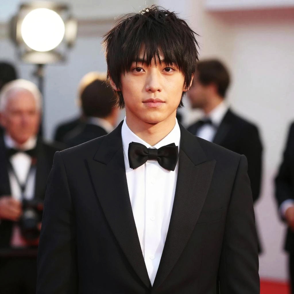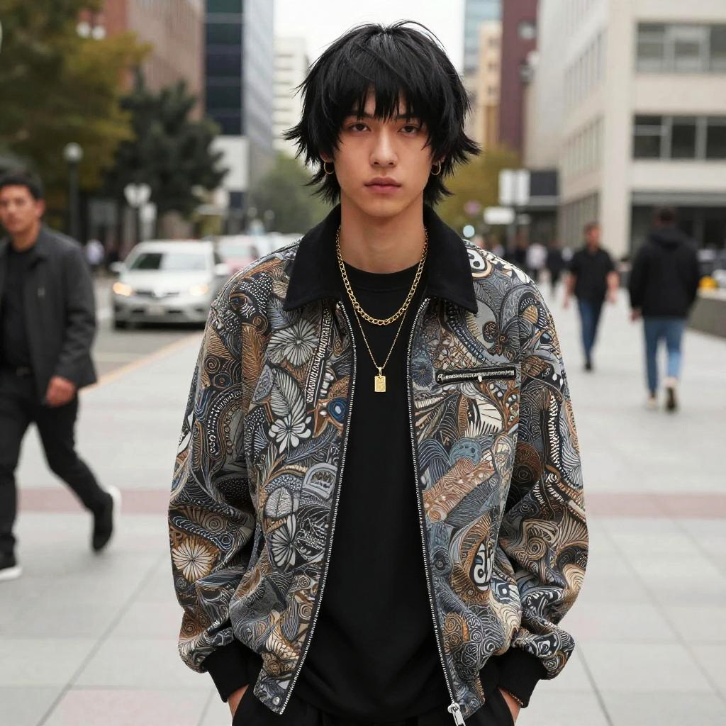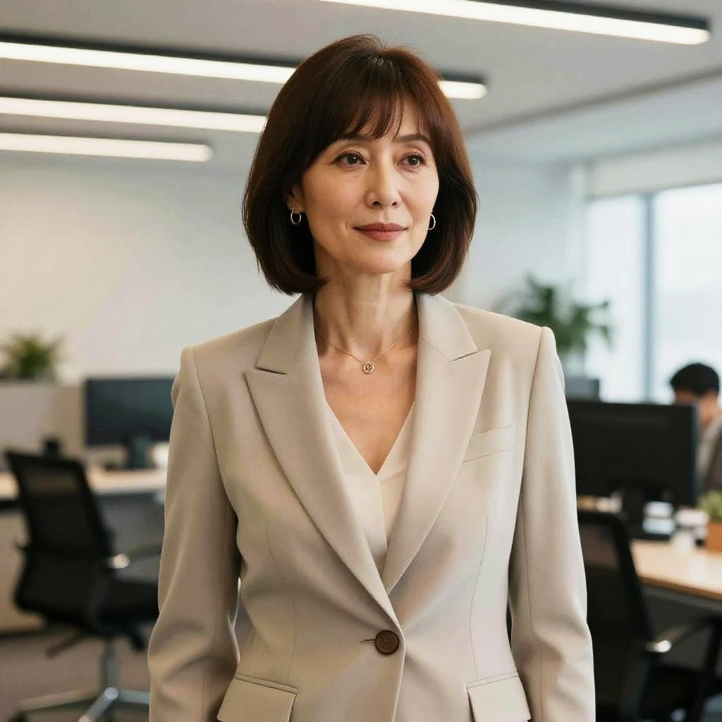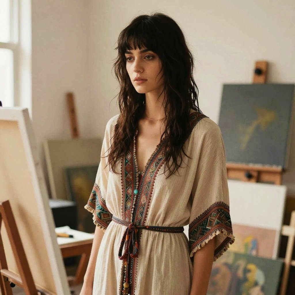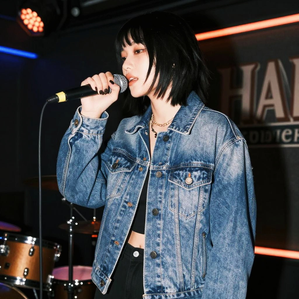 Blunt Fringe hairstyle on female musician, wearing casual denim jacket, in indie music venue, captured in fashion editorial style with moody stage lighting.