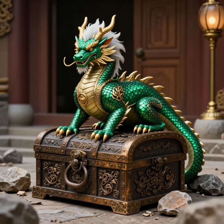 In this captivating image, a majestic emerald dragon, adorned with intricate gold accents, sits regally atop a large, ornate chest. The dragon's scales shimmer with a vibrant green hue, contrasting beautifully with its white mane and the golden rings adorning its neck. Its powerful claws, painted in shades of emerald and gold, grip the chest's handle, exuding an aura of strength and dominance. The chest itself is a marvel of craftsmanship, featuring intricate carvings and a sturdy, aged appearance, suggesting it has been a guardian of treasures for centuries. Surrounding the chest are scattered rocks and debris, adding to the rugged, ancient ambiance of the scene. In the background, a wooden door and a lamp with a golden base provide a sense of depth and context, hinting at a hidden treasure trove within. The overall composition is balanced, with the dragon and chest as the central focus, drawing the viewer's eye through the scene and inviting them to explore the mysteries that lie within.