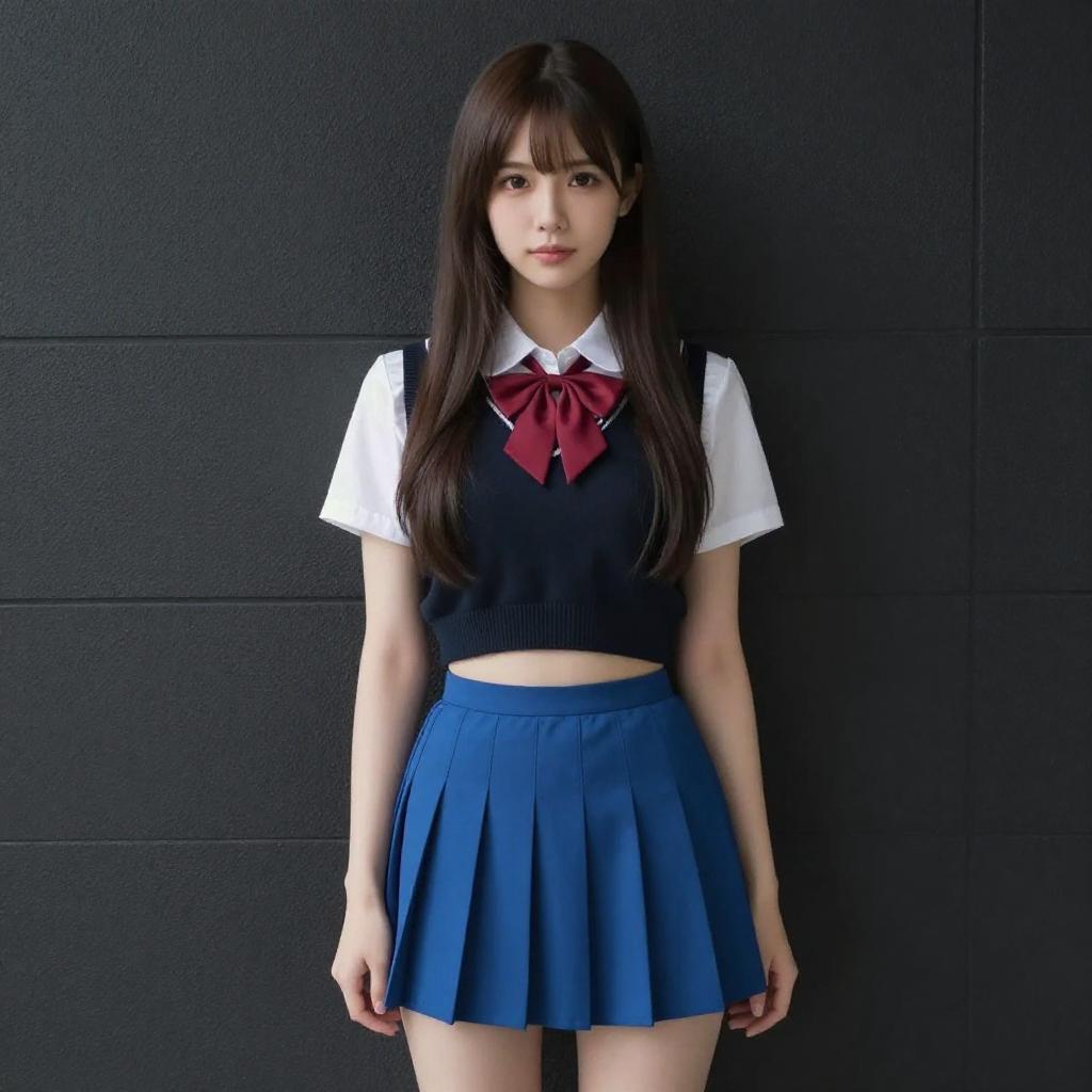 Portrait of a young woman wearing a cosplay outfit consisting of a blue pleated mini skirt and a black crop top with a white collar and red bow. She has long straight brown hair, medium skin tone, and stands against a dark textured wall with a relaxed expression. The image is photorealistic with cinematic lighting and sharp focus.