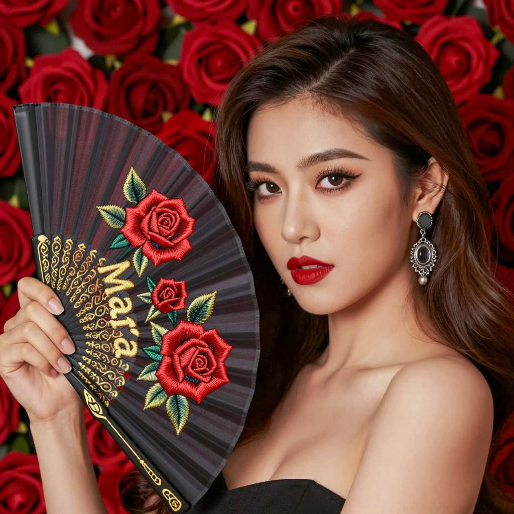 Photograph of a woman with fair skin, dark brown hair, and red lipstick, holding a black fan with red rose embroidery. She has dark eyebrows, large eyes with eyeliner, and wears ornate silver earrings. Background is densely packed red roses. She gazes directly at the camera with a neutral expression. Her left hand is visible holding the fan, and her right hand is not shown. The name "María" is on the fan.