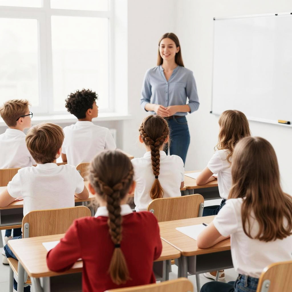 Blonde female teacher standing in front of a chalkboard, holding a clipboard and smiling at a group of students seated at desks in a classroom setting. Students include boys and girls with diverse hair colors and styles, wearing casual and school-appropriate clothing, facing the teacher from behind.