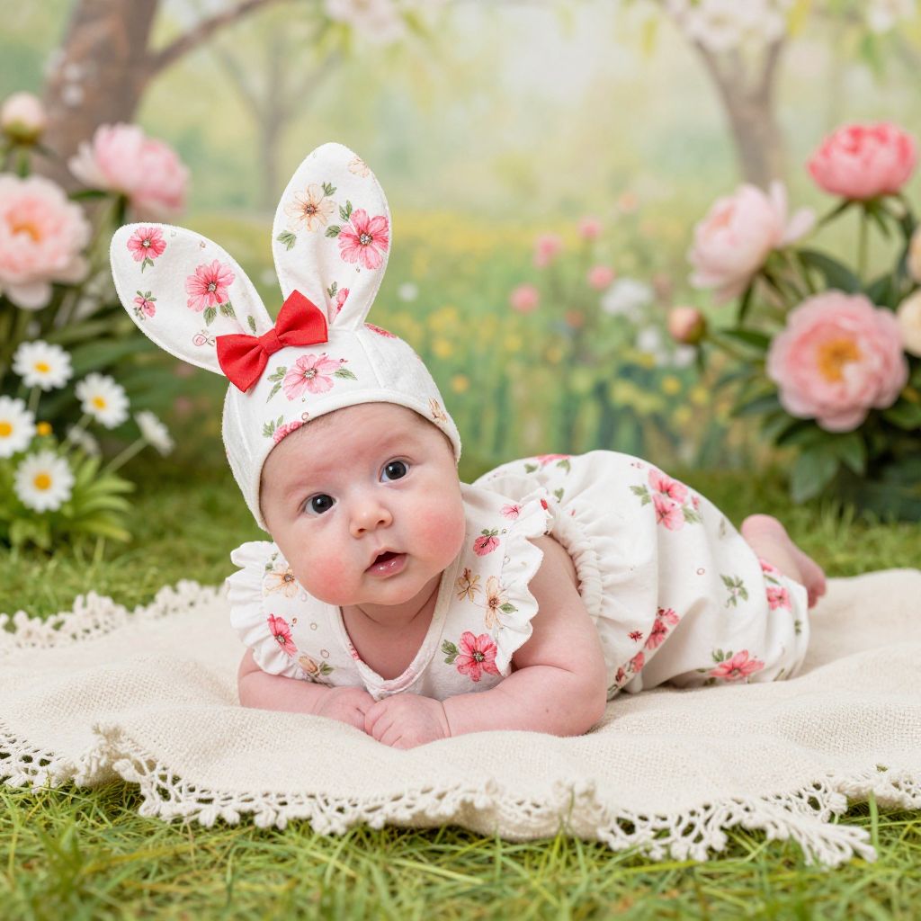 A charming newborn in a classic Easter costume made of hand-sewn white and pink floral fabric, dressed as a baby rabbit with a tiny red bow on the head, lying gently on a cozy blanket on a soft green grassy lawn under a blooming spring garden with pink peonies and daisies, the baby has rosy cheeks and wide, innocent eyes