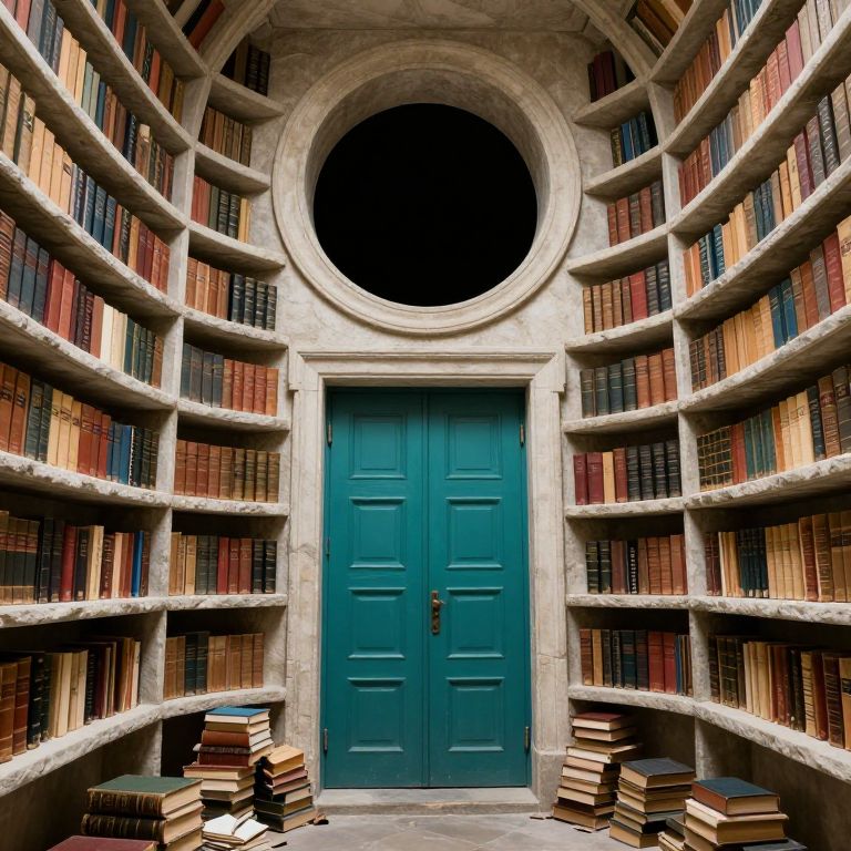 Majestic stone shelves encircle a dark, circular void above a grand teal door, flanked by towering bookcases filled with aged tomes, while scattered stacks of books and debris litter the floor below.