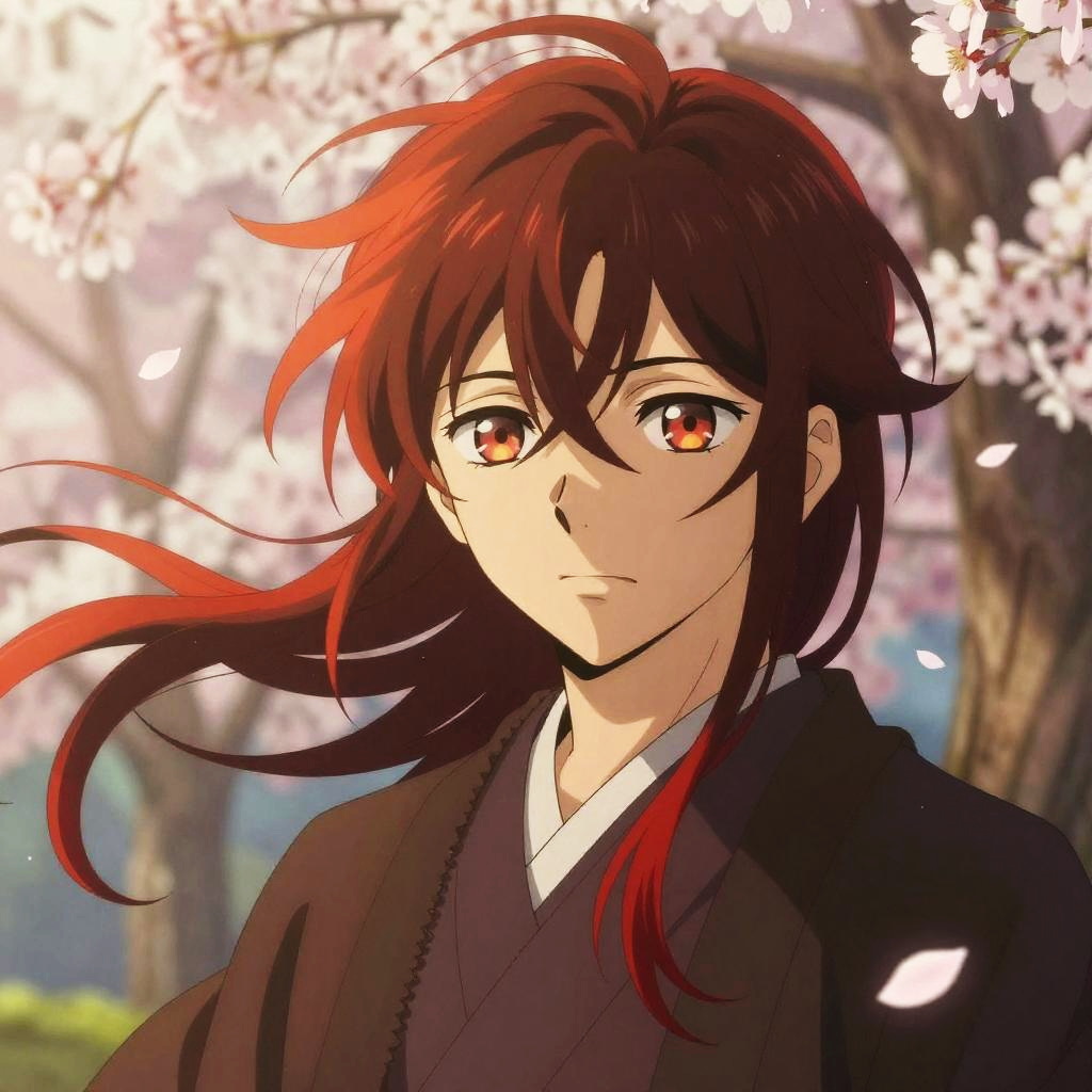 Hair highlights anime boy with messy chestnut hair accented with fiery red highlights, dramatic lighting, windy atmosphere blowing strands, soft focus background with sakura petals, emotive expression, traditional anime art style with rich detail