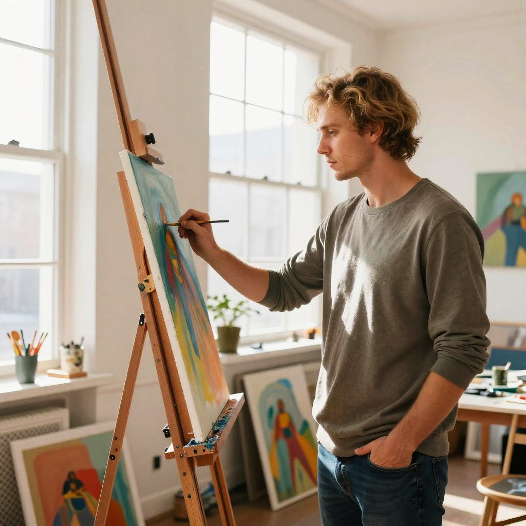 Dark blonde male artist painting in a bright studio, natural daylight streaming through large windows, surrounded by colorful canvases and art supplies, casual comfortable clothing, capturing creative focus and expressive atmosphere, high resolution detail.