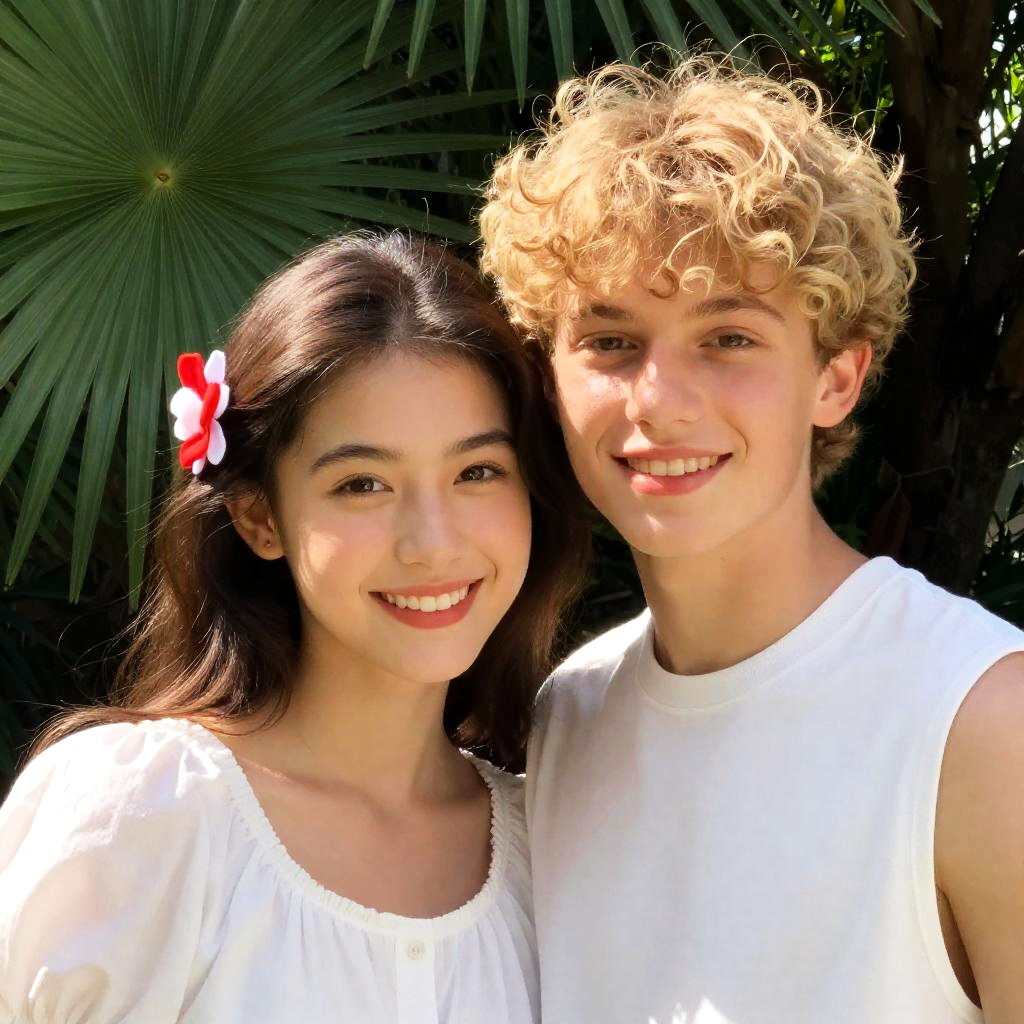 Photograph of a young couple. Man in black tuxedo, white shirt, black bow tie, short brown hair, neutral expression. Woman with dark hair in blue sequined dress, smiling, hair adorned with small white flowers. Background: fairy-tale castle, sparkling stars, trees. Man stands slightly to the left, woman to the right, both looking down at each other.