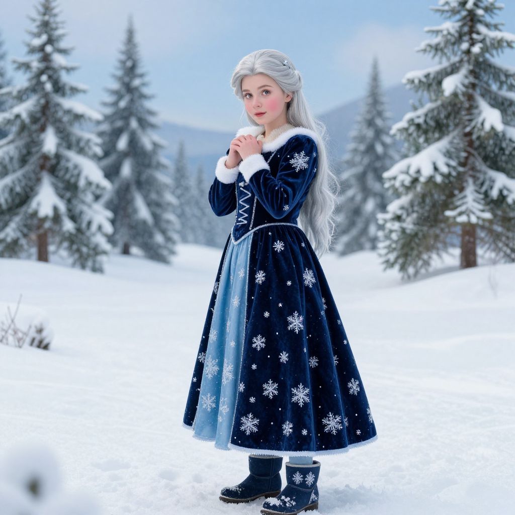 Photograph of Princess Rapunzel in a winter princess costume featuring a deep blue velvet dress with snowflake patterns, long silver hair flowing down her back, and boots with snowflake details; she stands in a magical snowy meadow with pine trees and a clear winter sky; her face has soft features, rosy cheeks, and a shy, curious expression as she looks toward the camera