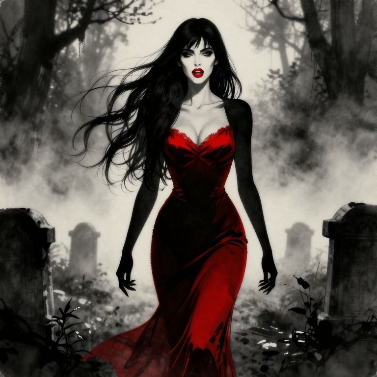 Gothic digital painting of a pale-skinned woman with long white hair, red lips, and intense red eyes, set against a black and white