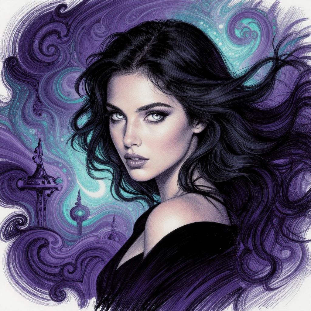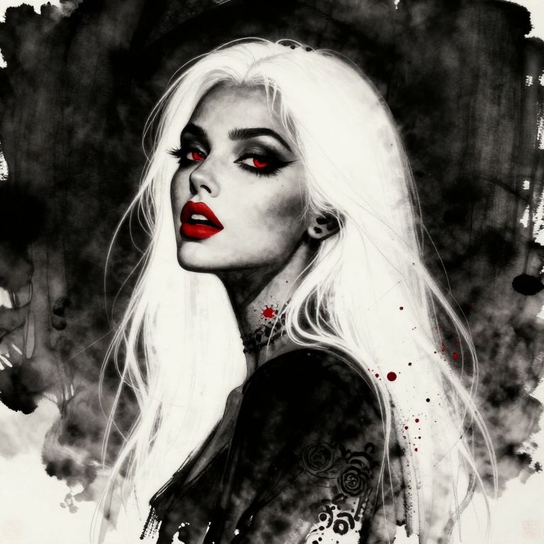Digital drawing in a high-contrast, black-and-white style with splashes of red. A pale-skinned woman with long, flowing white hair and striking red lips gazes intently to the right. Her dark, smoky eye makeup enhances her intense expression. She wears a black top with intricate patterns on the shoulder. The background is a chaotic mix of black ink splatters and white highlights, adding a dramatic, gothic atmosphere. A small red spot is visible on her neck, adding a hint of violence or danger to the image.