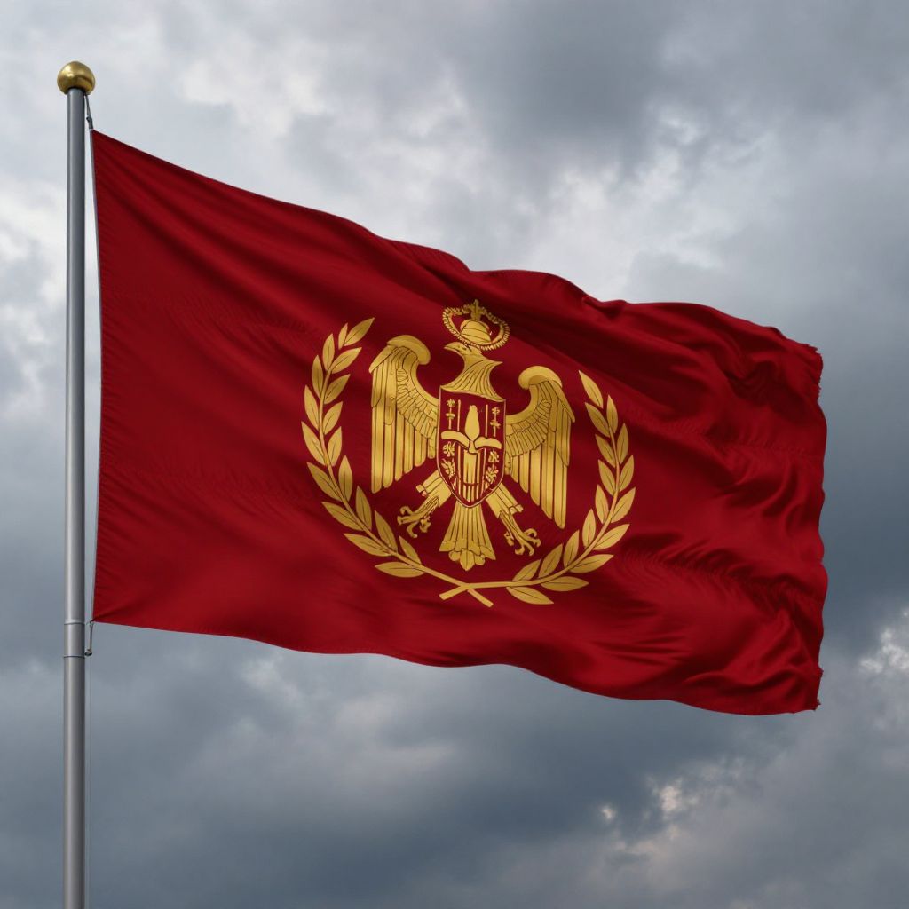 Photograph of a red flag with a golden double-headed eagle and laurel wreath, waving against a cloudy sky.