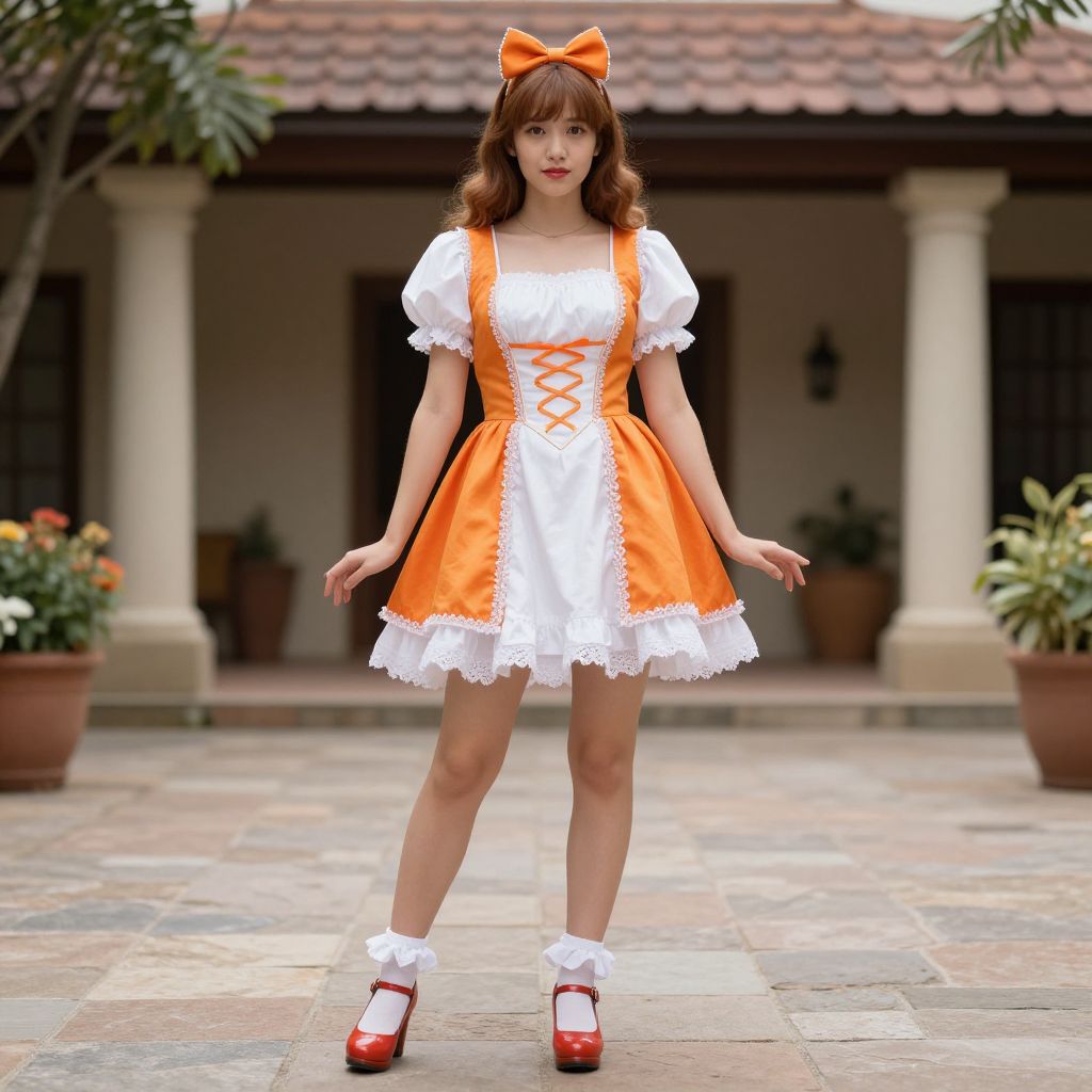 Young Asian woman in orange and white Lolita dress, red bow, white socks, red Mary Janes, standing on stone patio. Photorealistic