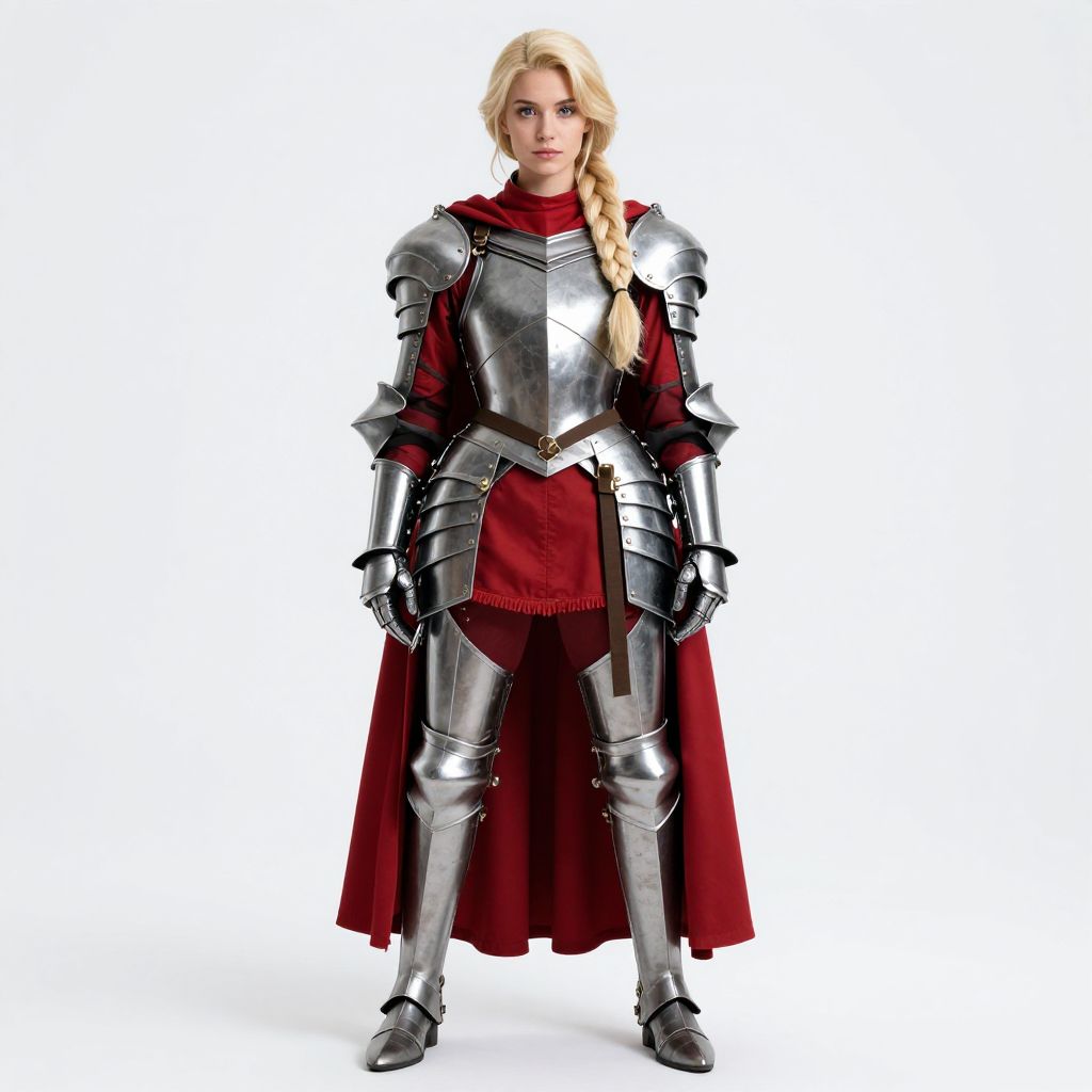 Photograph of a blonde woman in shiny silver medieval armor with a red cape, standing confidently against a white background.