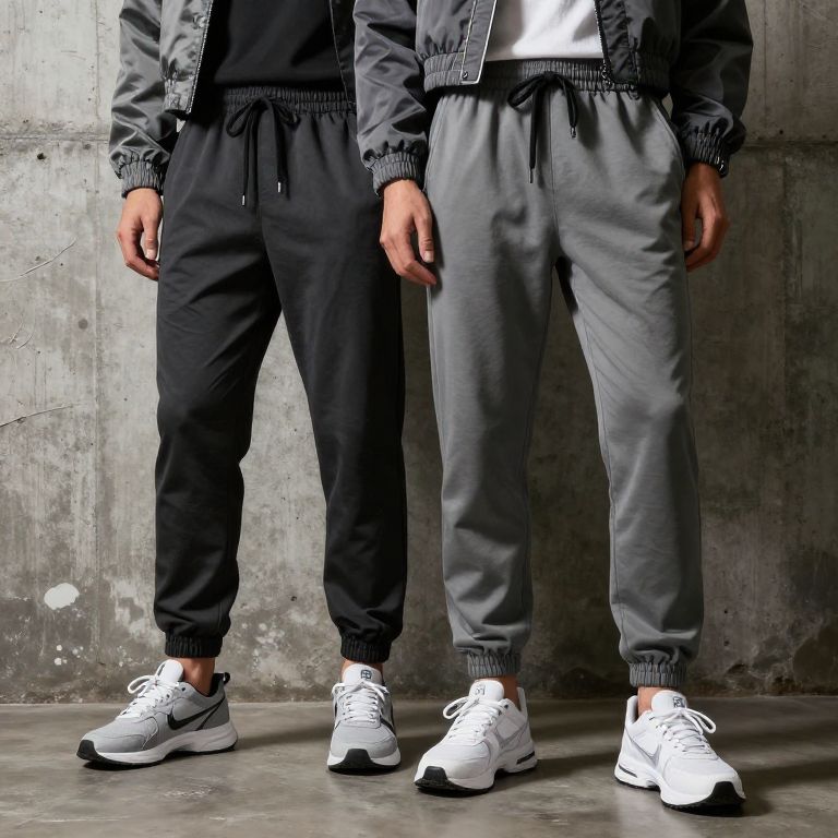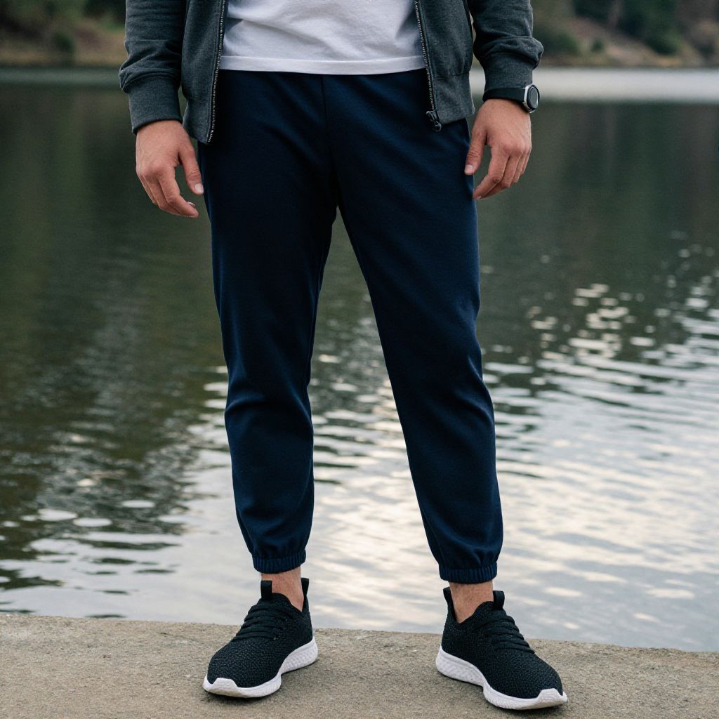 A European man wearing fashion-forward joggers paired with a chunky sneaker and a fitted bomber jacket, set against a minimalist urban backdrop for a stylish editorial look.