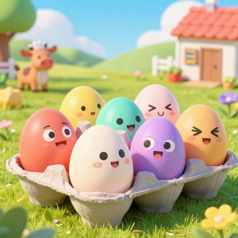 Cartoon style eggcart overflowing with oversized cartoon eggs, bright and playful colors, cheerful farm background with smiling animals, sunny day, whimsical and joyful atmosphere, high saturation