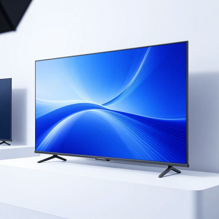 Photograph of a sleek, modern flat-screen TV with a vibrant blue wavy pattern on the screen, standing on a black metal stand, in a