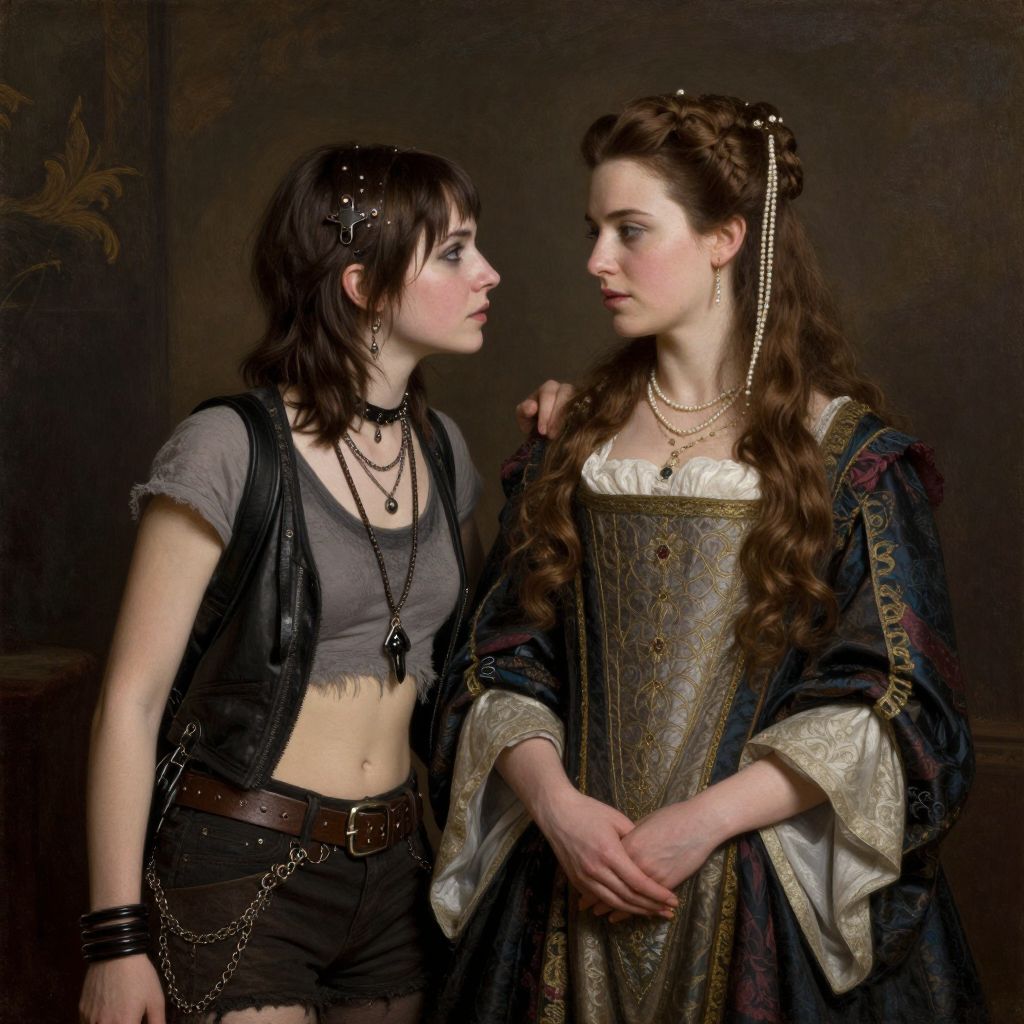 A photograph featuring two women in a dark, classical setting. The woman on the left has short, dark brown hair, pale skin, and wears a gray crop top, black leather vest, and black shorts with chains and bracelets. She gazes intently at the other woman. The woman on the right has long, curly brown hair adorned with pearls, pale skin, and wears an ornate, medieval-style dress with gold embroidery and a blue cloak. She looks back at the first woman with a calm expression. The background is dark with subtle, decorative elements. The contrast between their modern and historical attire is striking.