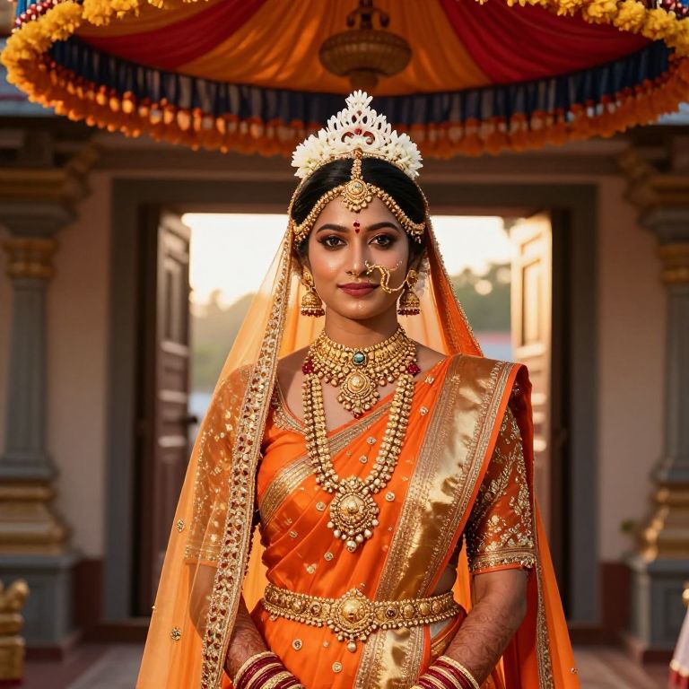 A traditional Hindu bride wearing a vibrant orange and gold silk lehenga with a sheer border and intricate beading, complete with a large floral crown and heavy gold jewelry, her features clearly defined with warm brown eyes and glowing golden skin, standing under a colorful silk canopy during a wedding ceremony in a traditional South Indian temple compound at dawn, soft golden light filtering through the open doors, cinematic lighting.