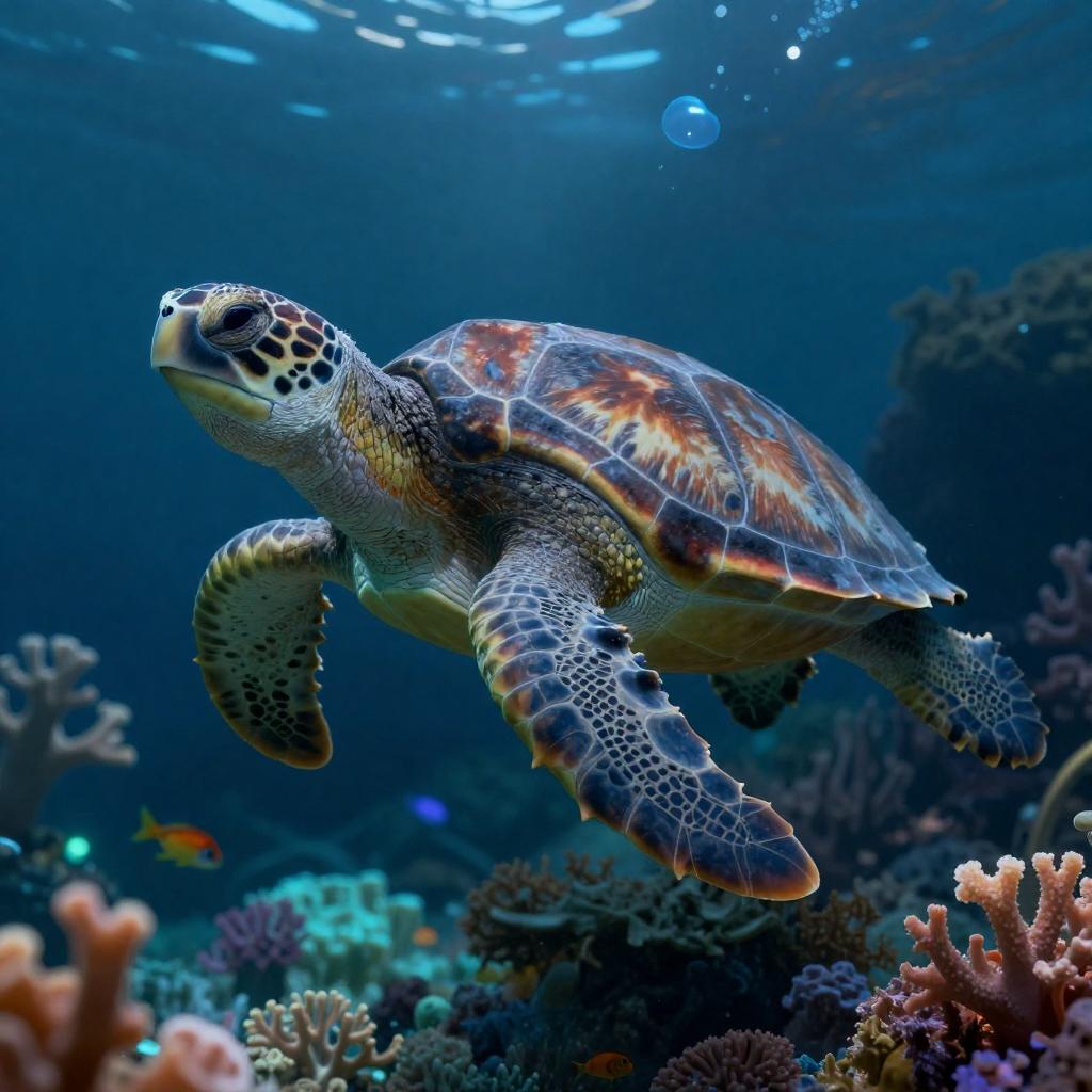 A stunningly realistic digital artwork depicting an ancient sea turtle sporting a bioluminescent coral crown and a ceremonial kelp robe. Its tongue is playfully sticking out, and this ultra-detailed piece boasts a 4K resolution, currently trending on various art platforms, showcasing exquisite details and a cutting-edge aesthetic.