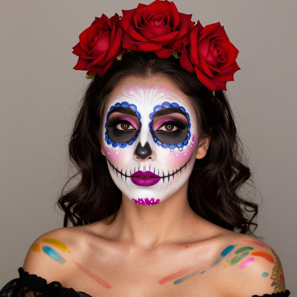 Woman wearing vibrant Catrina makeup featuring intricate designs with red roses adorning her hair and colorful temporary tattoos embellishing her shoulders.