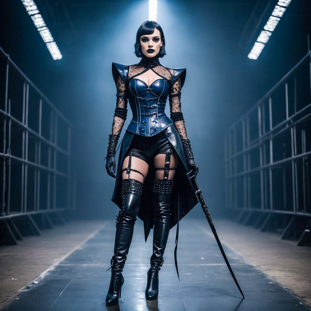 Photo of a Hourglass shaped woman, Asymmetrical Bob, dominatrix outfit, black leather corset with Midnight Blue accents, thigh-high boots made of Mesh, fishnet stockings, stilettos, studded choker, latex gloves, band performance, surreal aesthetics