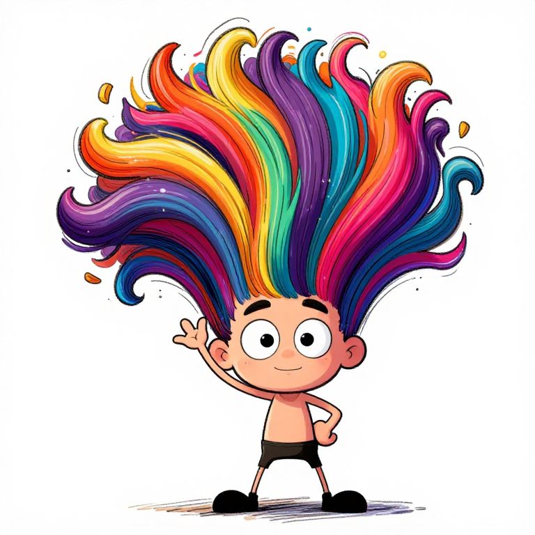 Tall hair cartoon character with exaggerated gravity-defying hairstyle, vibrant colors, expressive eyes, playful pose, bright background, hand-drawn style with dynamic lines and bold shadows, capturing a fun and whimsical atmosphere.
