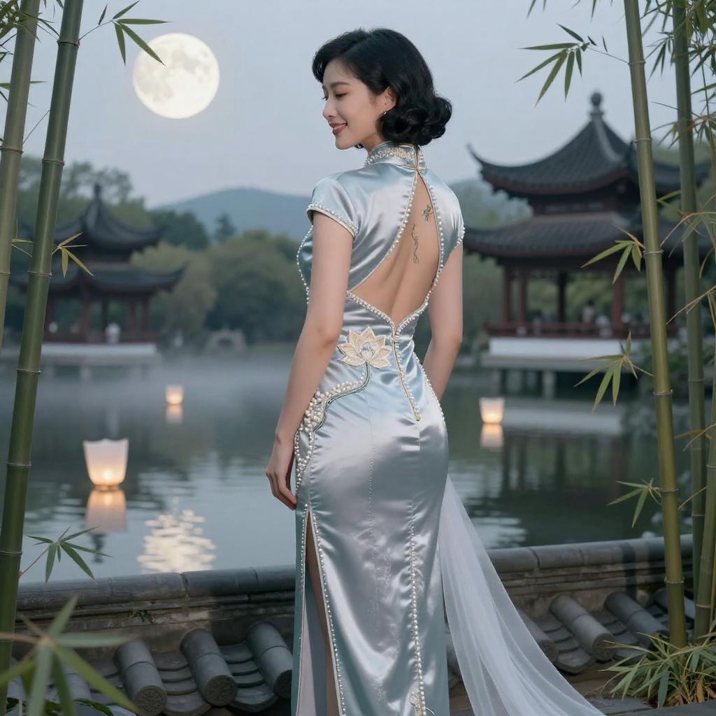 Masterpiece, best quality, (photorealistic:1.4), full body, ultra-detailed photo of a petite East Asian woman with a sleek raven bob curled inward at the ends, porcelain skin and a small koi tattoo on the nape, smiling with an hourglass silhouette, viewed completely from behind, wearing silver-blue silk cheongsam-inspired gown with a low open back, high side slit, fitted waist, embroidered pearl-and-lotus motifs tracing the spine and a sheer chiffon train, standing in a moonlit rooftop bamboo garden overlooking a jade-lit pagoda lake with drifting paper lanterns and soft mist at dusk, smiling with an hourglass silhouette, viewed completely from behind