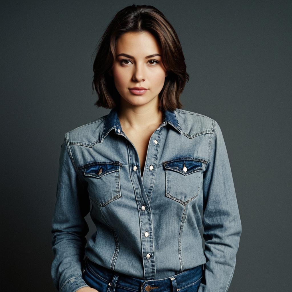 Trendy attire,1girl, solo, denim, jewelry, jeans, realistic, necklace, pants, brown hair, shirt, short hair, brown eyes, outdoors, looking at viewer, long sleeves, bag, blurry background, blurry, cowboy shot, lips