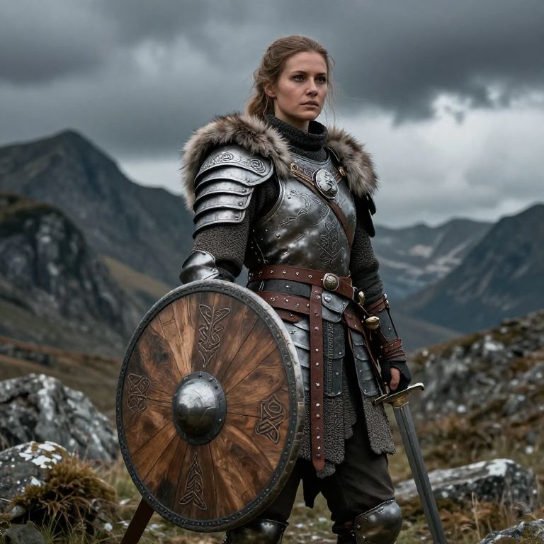 Shield maiden armor, a fierce female Viking warrior clad in layered steel and leather armor with fur trim, ancient Norse patterns embossed, holding a round wooden shield and a sword, set against a rugged mountain backdrop under a stormy sky.