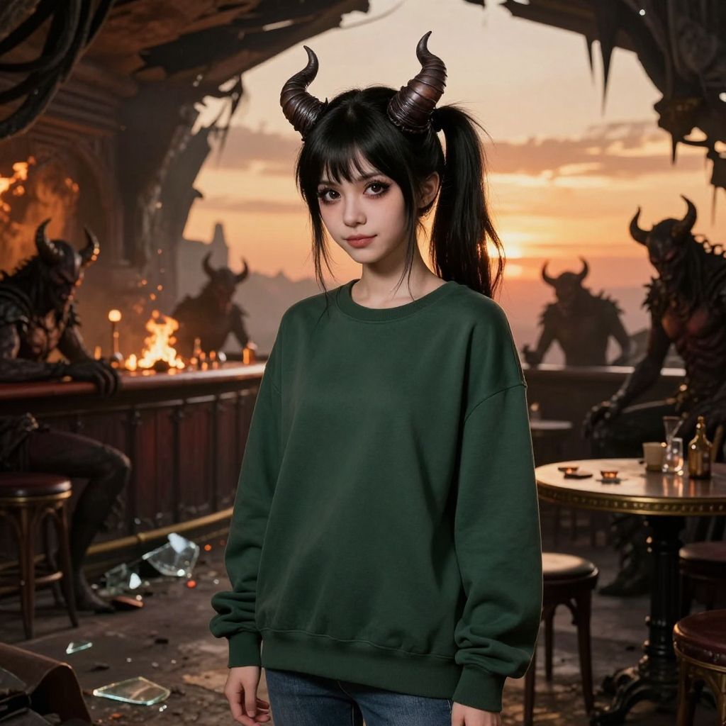 Masterpiece, (8:00 pm), after sunset, amber glow, Rembrandt lighting, photorealistic, sharp focus, from a standing position, 1girl, 26-year-old succubus, (cute: 1.5) (petite: 1.3), black hair, (bushy ponytail: 1.3), (small horns: 1.3), (tiny body: 1.5) (160cm height: 1.5) (small breasts: 1.5) With Thick Eyelashes, small mouth, (realistic skin texture: 1.3), dark hazel eyes, (extremely delicate: 1.3), at a bar in the demon realm, (collapsed ceiling), (on fire), rubble, trash, broken glass, debris, demons, (sitting at a table: 1.3), wearing a (large, boxy, dark-green (crew-neck: 1.3), long-sleeve shirt) and (jeans), (gentle, contented smile)