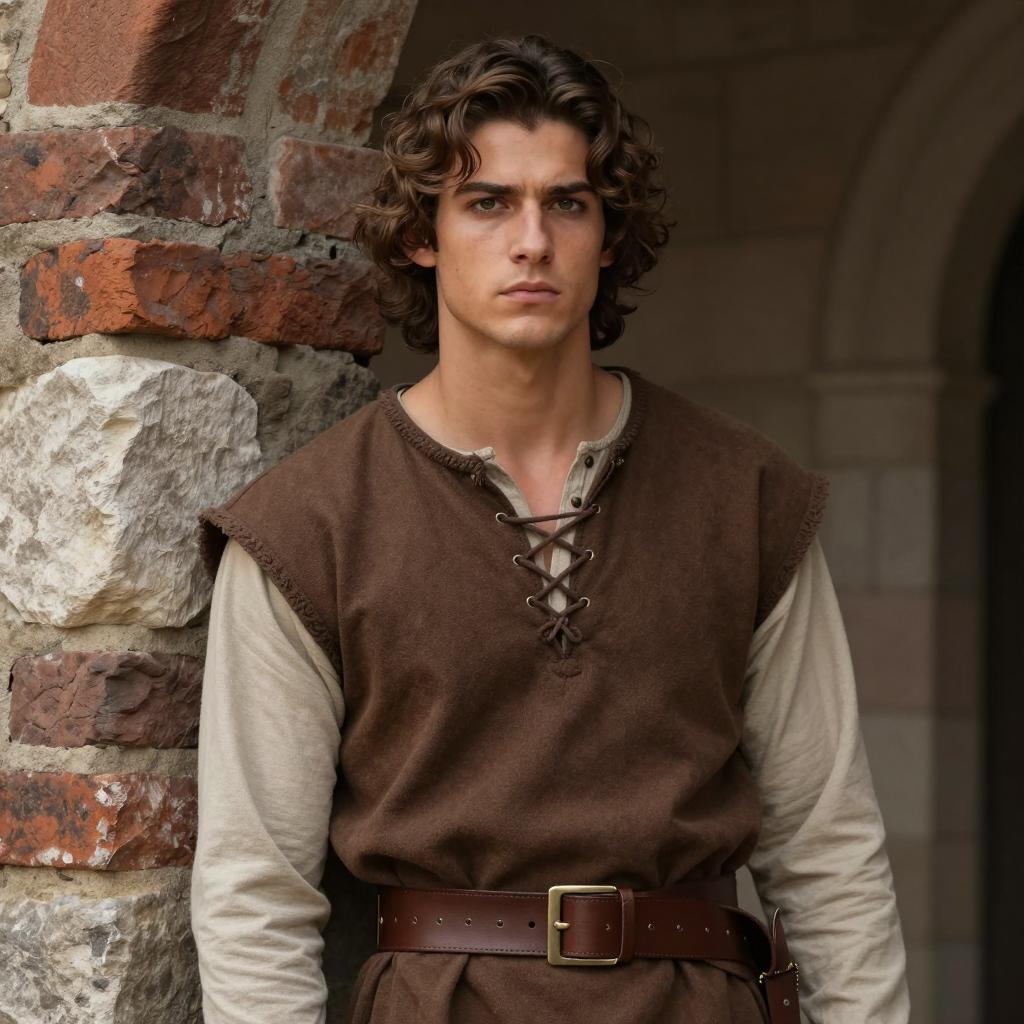 Medieval times costume, photorealistic, young man with long brown hair, wearing medieval-style clothing, white hooded cloak, beige tunic with red sleeves, lace trim, brown leather belt, cross necklace, brown strap across chest, standing outdoors, rustic wooden building in background, daytime, clear blue sky, realistic ures, medium shot, centered, focused on face, neutral expression, slight smile, natural light, detailed clothing, historical costume, realistic rendering, soft shadows, medium close-up