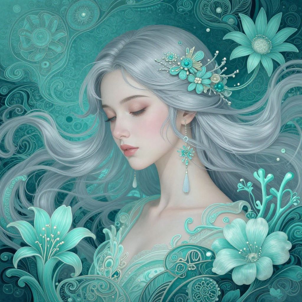 This ethereal artwork features a serene woman with flowing silver hair, surrounded by intricate aquatic elements in a mesmerizing palette of teal and aqua. Her delicate features and tranquil expression evoke a sense of calm, while the detailed floral and marine motifs create a dreamlike atmosphere.