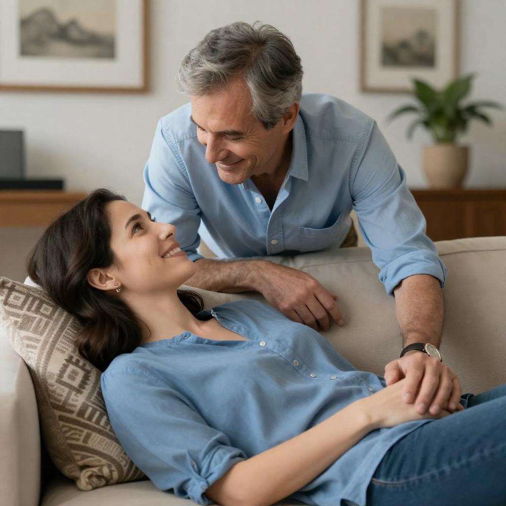 Photograph of a smiling couple seated on a rustic cart against a rocky cliff. The woman, with short brown hair and a white sleeveless top, sits on the man's lap. He wears a white shirt and beige pants. Sunlight illuminates the right side, casting shadows on the rocky background. A wicker basket is on the cart.