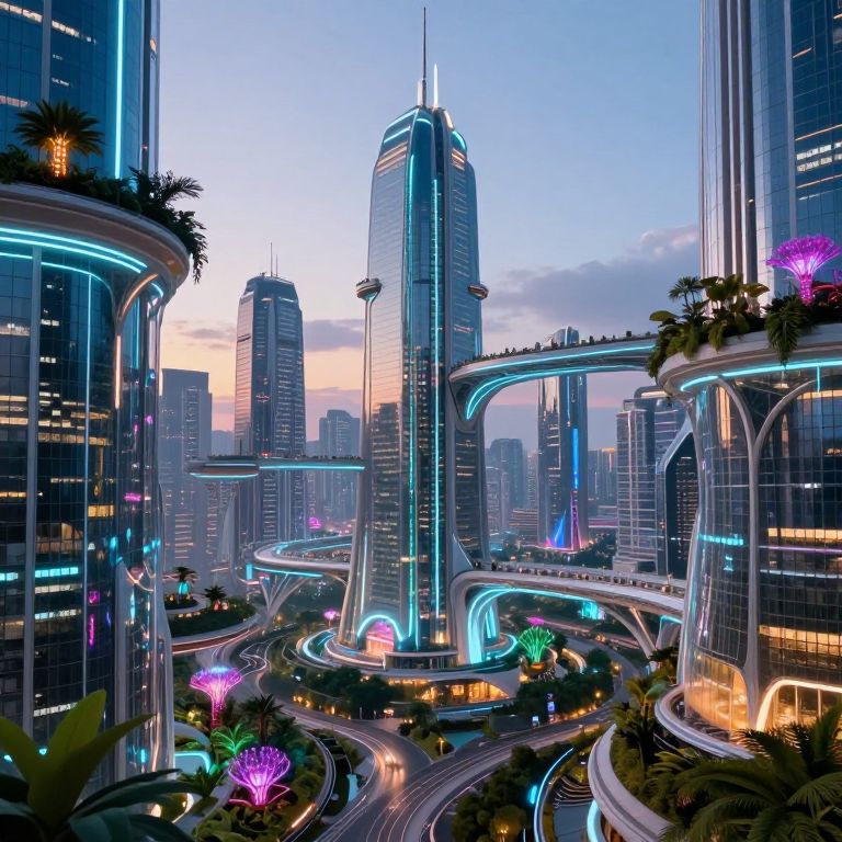 Digital CGI of a futuristic cityscape at dusk, featuring glowing skyscrapers, neon-lit highways, vibrant purple and green floral displays, and illuminated
