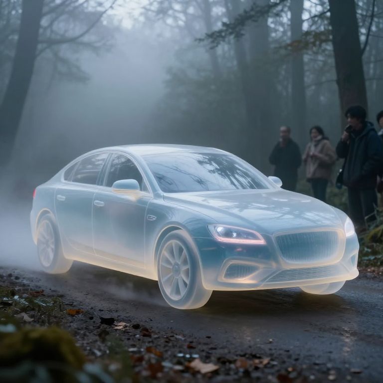 A translucent, jellyfish-like automobile glides silently through a foggy forest, its mirror-like body reflecting shifting dreams from the minds of onlookers.