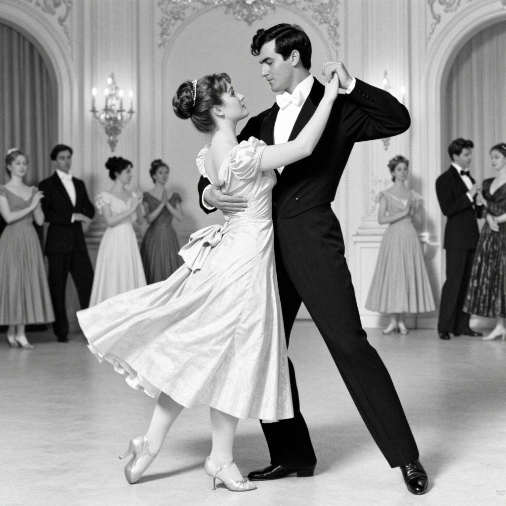 A black-and-white photograph of a couple dancing in a grand ballroom. The woman, with her hair in an elegant updo, wears a flowing, light-colored dress with short sleeves and a cinched waist. The man, in a dark tuxedo with a bow tie, holds her close. In the background, a group of people, including women in dresses and men in suits, watch the couple. Ornate arches and a lit chandelier adorn the elegant walls. The image has high contrast, emphasizing the dancers in the foreground.