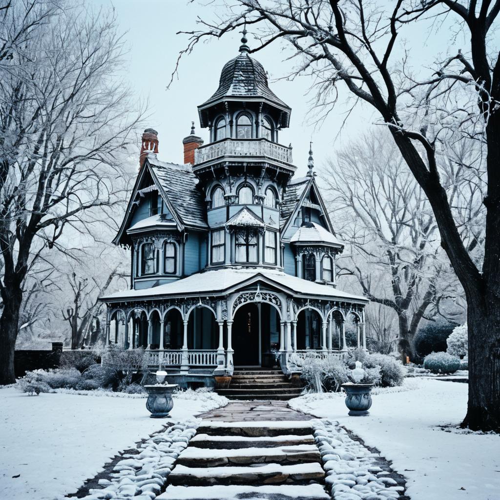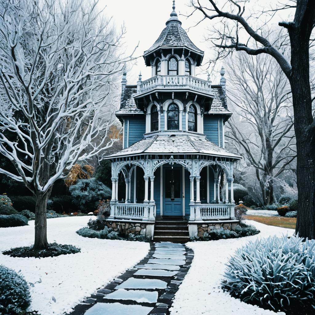 A charming Victorian-style garden tower featuring intricate woodwork and architectural details. The blue and white structure is surrounded by frosted leafless trees and shrubs, with a winding stone pathway leading to the front entrance. The late-winter scene captures a cold yet cozy atmosphere with light snow covering the ground and icy hues throughout the landscape.
