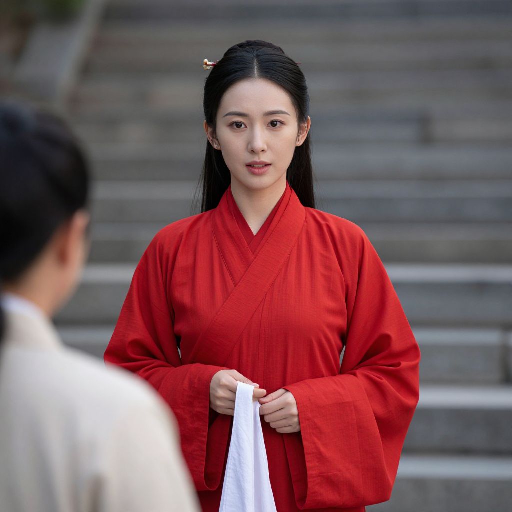 Woman in traditional red attire stands poised, her hands delicately holding a white sash as she engages in conversation with another individual whose back is turned to the camera.