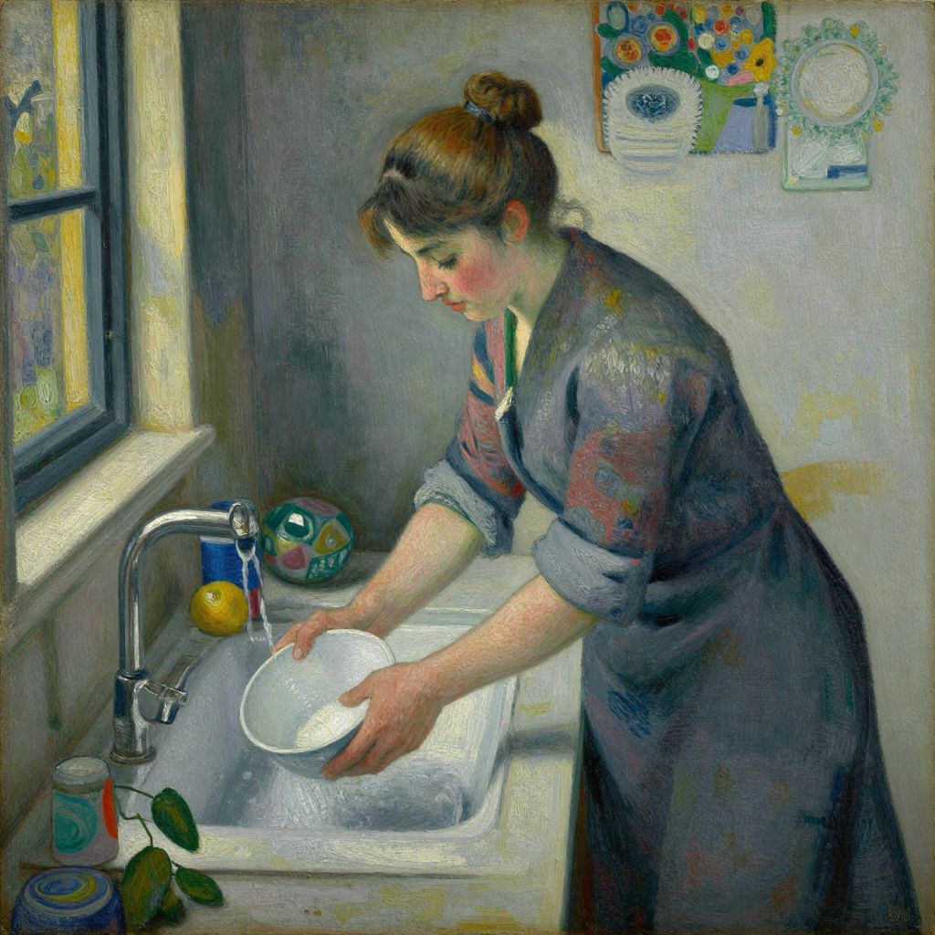 An oil painting by Camille Pissarro depicting a woman washing dishes at a sink near a window. The woman has brown hair styled in a bun and is wearing a greyish-blue dress with rolled-up sleeves. The scene is set indoors with soft natural light coming through the window, highlighting details such as a lemon, ceramic bowl, and colorful objects on the windowsill.
