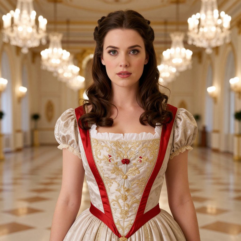 Photograph of a young woman with fair skin and dark, wavy hair styled in soft curls, standing in an opulent, grand hall with a checkered floor and chandeliers. She wears a white, puffed-sleeve dress with gold floral embroidery and red trim, reminiscent of a Cinderella-style gown. Her expression is neutral, with slightly parted lips and large, dark eyes. The background is blurred, highlighting the luxurious setting. The image has a soft, warm lighting that enhances the elegance of the scene.