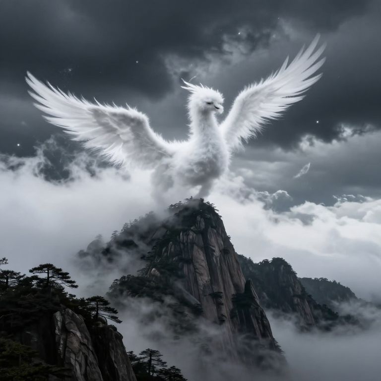Digital artwork of a luminous white angel with outstretched wings soaring above misty, dark mountain peaks under a stormy, cloudy sky.