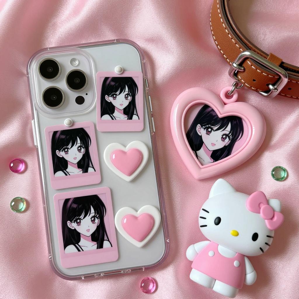 Pink-themed photo. Clear phone case with black-and-pink anime characters, three small pendants, two pink and white heart-shaped photo holders, pink pendant with heart frame, brown leather belt with silver buckle, white and pink Hello Kitty figurine, pink satin fabric background. Anime girls with large eyes and black hair on photos and pendants. Round pink and green gemstones scattered. Pink and white objects arranged on satin.