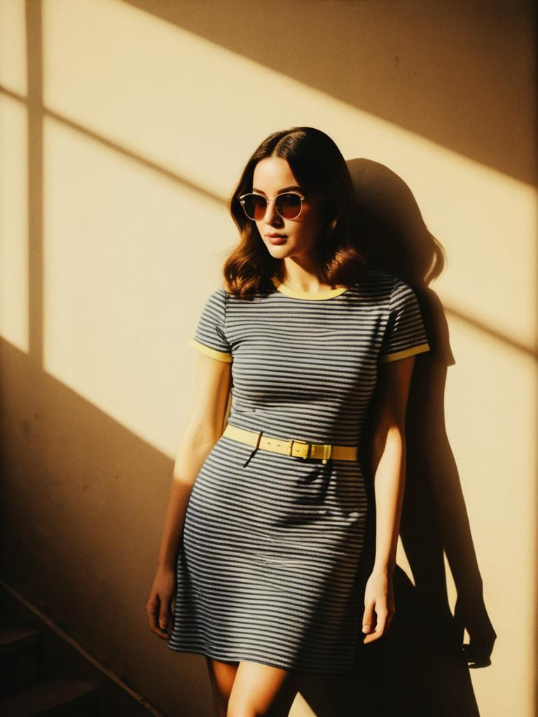 Woman, casual, navy and white horizontal striped short dress, neon yellow trim on neckline and sleeves, round neckline, short sleeves, fitted silhouette, above-the-knee length, black sunglasses. --sref 1390