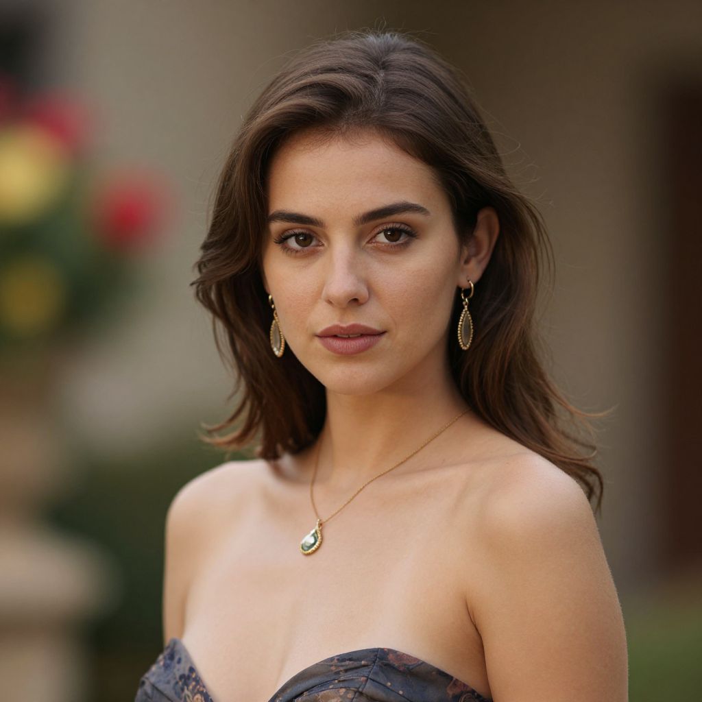 Photograph of a young woman with medium brown skin and dark brown, wavy hair that falls just past her shoulders. She has dark, well-defined eyebrows, brown eyes, and wears mauve lipstick. Her attire includes a strapless, dark gray dress with subtle texture. She accessorizes with gold drop earrings and a delicate gold necklace featuring a small, crescent-shaped pendant. The background is softly blurred, showing a mix of green foliage and red and yellow flowers, creating a bokeh effect. The woman's expression is neutral, and she is centered in the frame, from the chest up.