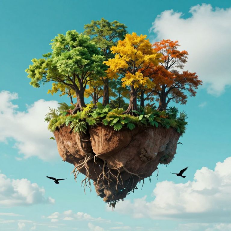Suspended in a serene azure sky dotted with fluffy white clouds, a floating island of rich brown soil cradles an inverted forest of vibrant trees, their roots sprawling downward while their colorful canopies of green, yellow, and orange foliage reach toward the heavens, accompanied by three black birds soaring gracefully beneath.