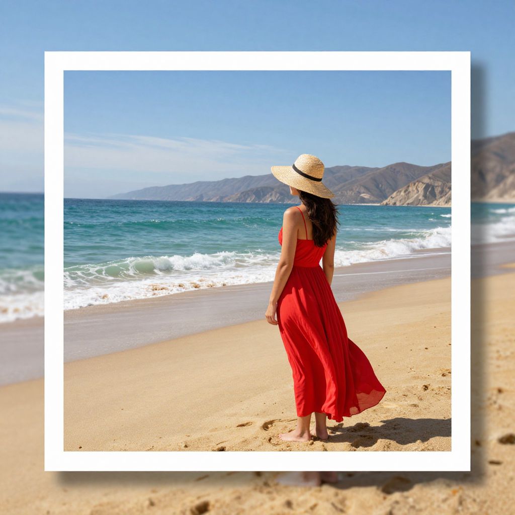 Photograph of a woman standing on a sandy beach facing the ocean. She has long dark hair and wears a wide-brimmed straw hat and a flowing, sleeveless red dress that reaches her ankles. The turquoise water gently laps at the shore, with small waves and white foam. In the background, a hilly, rocky coastline extends into the distance under a clear blue sky. The beach is empty, and the woman stands alone, gazing at the sea. A white border frames the image.
